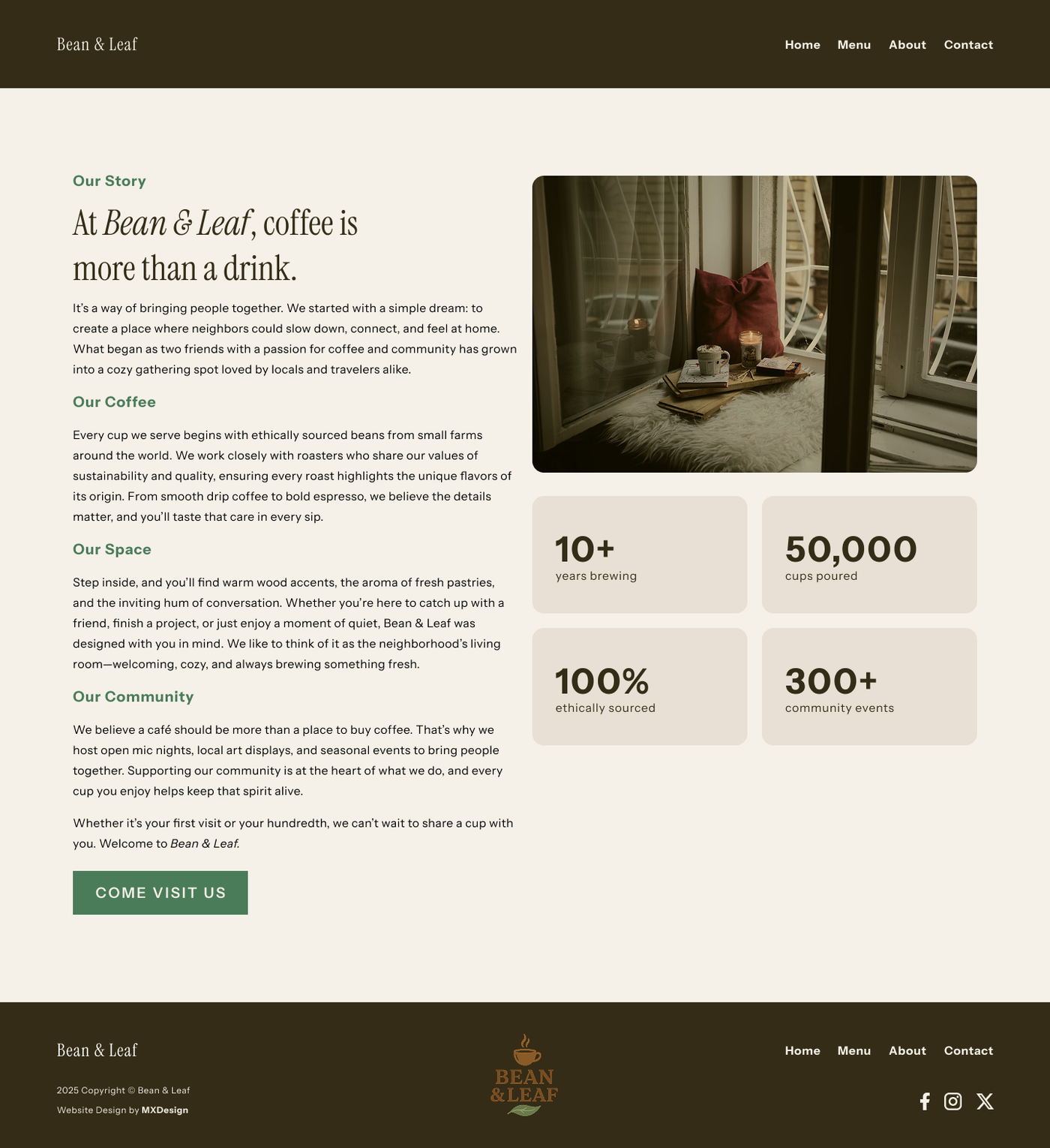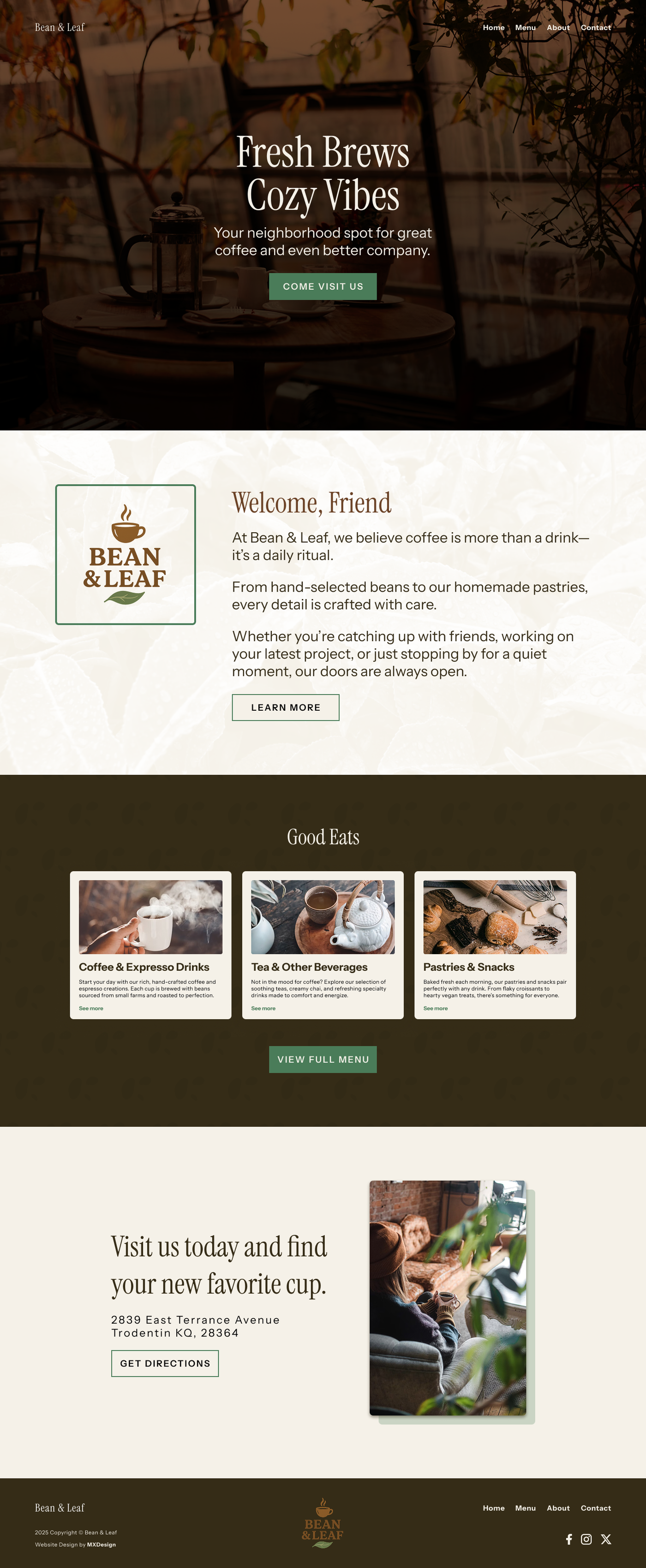When it came to typography, I wanted a gentle serif font that gave the site an edge of old fashioned, like the feeling of walking into an old bookstore. For the body text, I uses a sans-serif from the same family. The sans-serif provides better readability, and together, Instrument Serif and Instrument Sans provided that soft, somewhat vintage feel to match the vibe of the cafe.