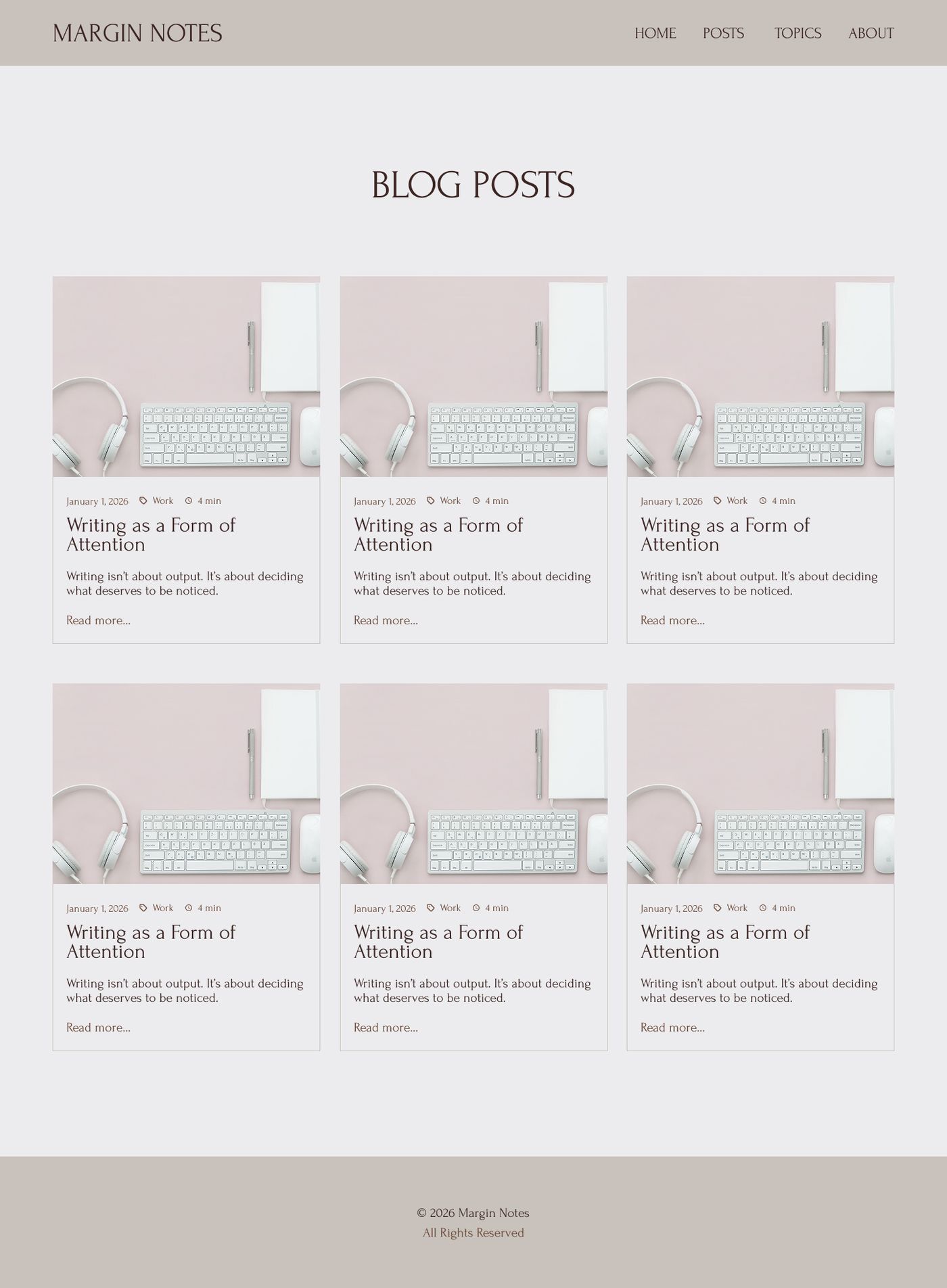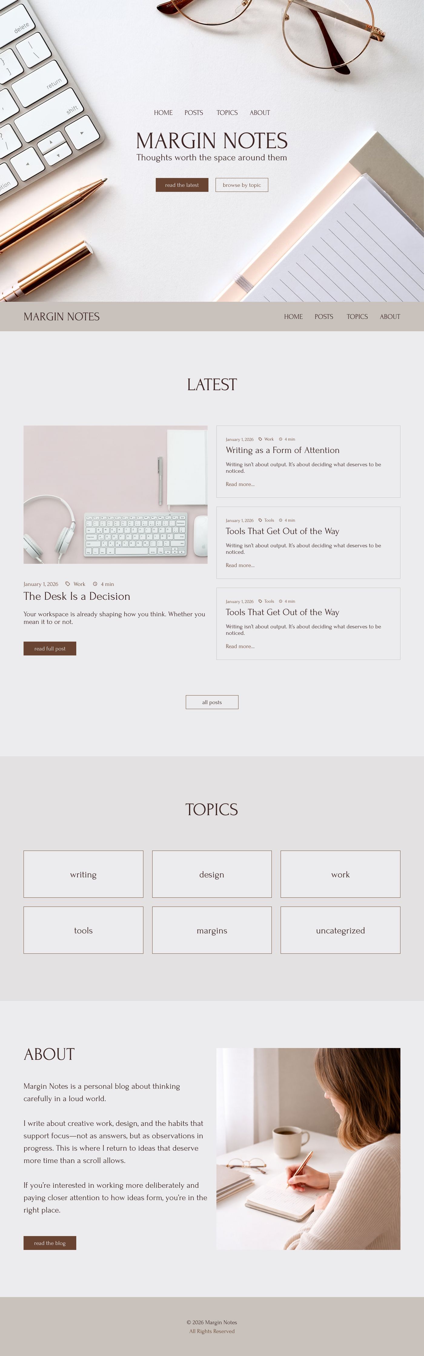 Since Margin Notes was a about space and clarity, I made sure to let the elements on the page breathe with plenty of whitespace. I used light colors sampled from the hero image and a gentle serif font to convey that calm, comfortable, thoughtful feeling.